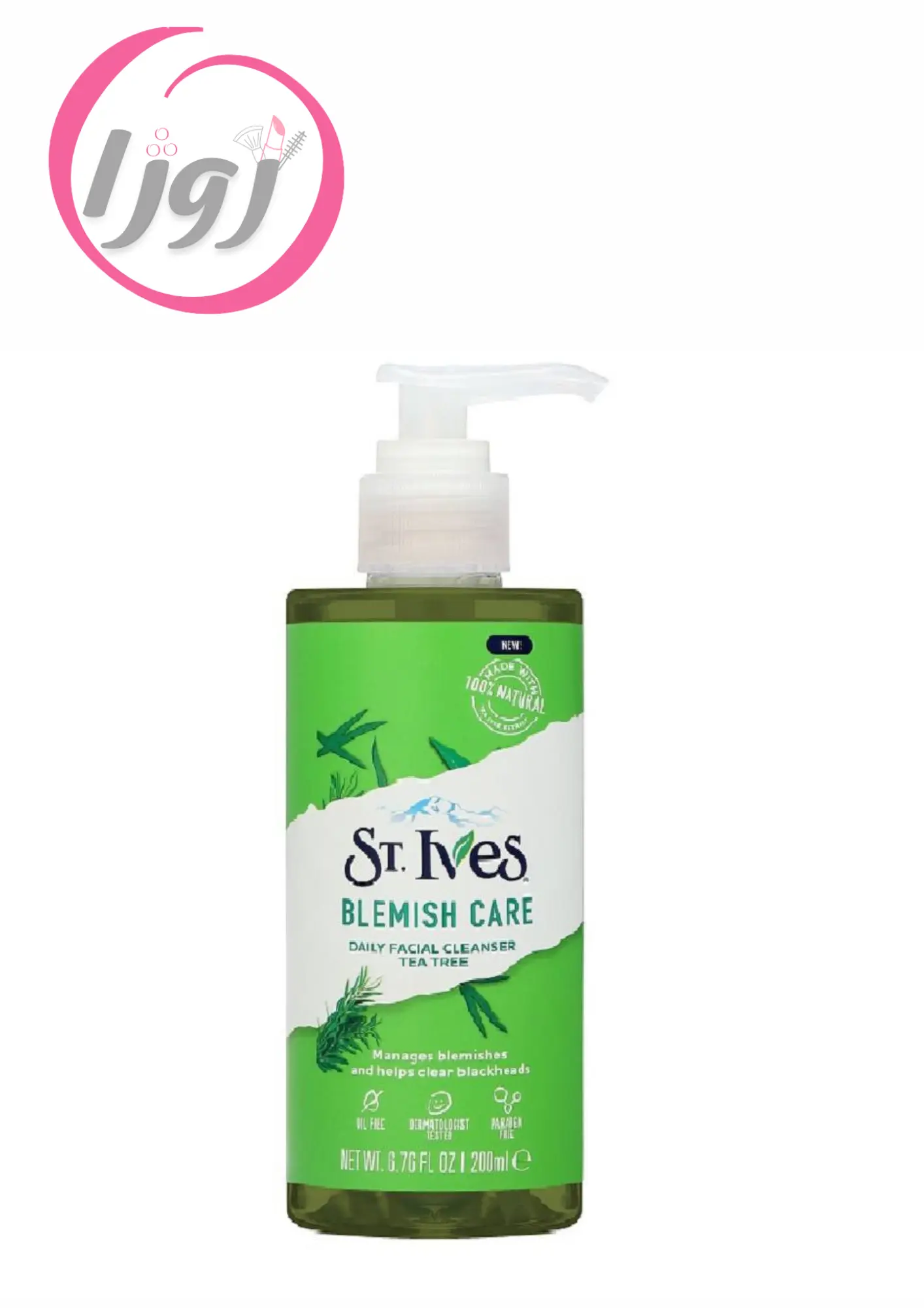 پاک کننده روزانه صورت St. Ives Blemish Care با عصاره درخت چای بدون عطر و مناسب برای پوست های حساس است.